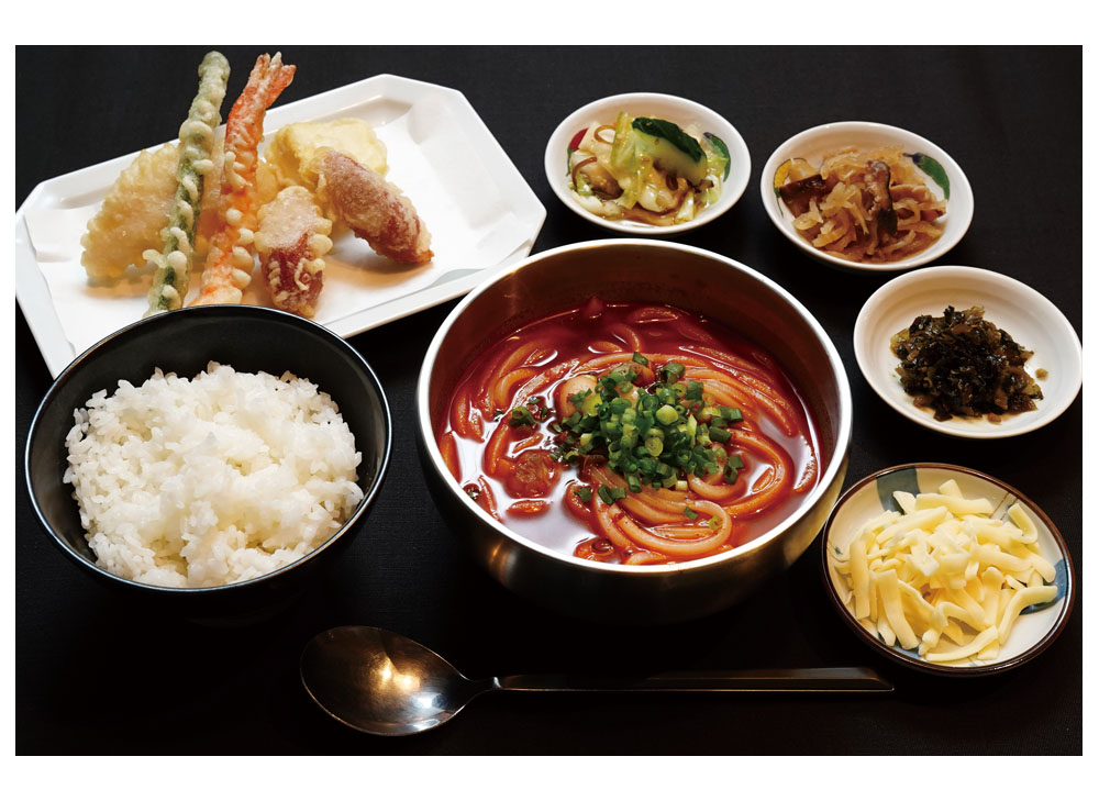 チゲうどん、海老×1、白身魚×1、野菜×1、豆腐×2、トウモロコシ×1
