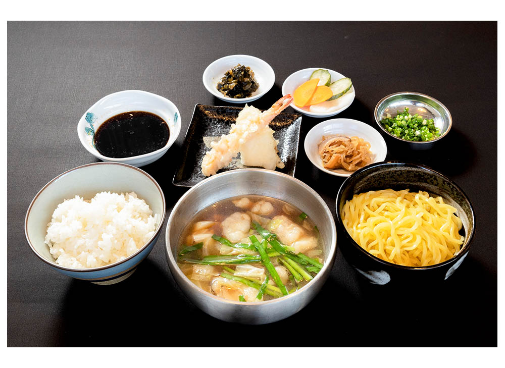 えごま油のつけ蕎麦、海老×1、鶏または白身魚×1、野菜×3